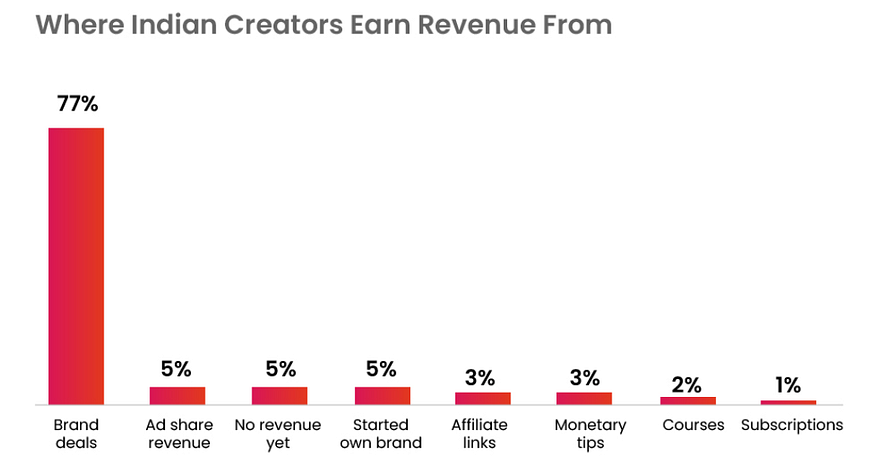 From a creator standpoint: Influencers with 100k+ followers already pay taxes on their earnings from large brand collaborations especially because of the large quantum of money involved. In all likelihood, this is MOST going to affect nano influencers (<10k followers) the most, since most of the collaborations they do are on a barter basis. As seen below, a SIGNIFICANT amount of creator revenue comes via brand deals: (Source)