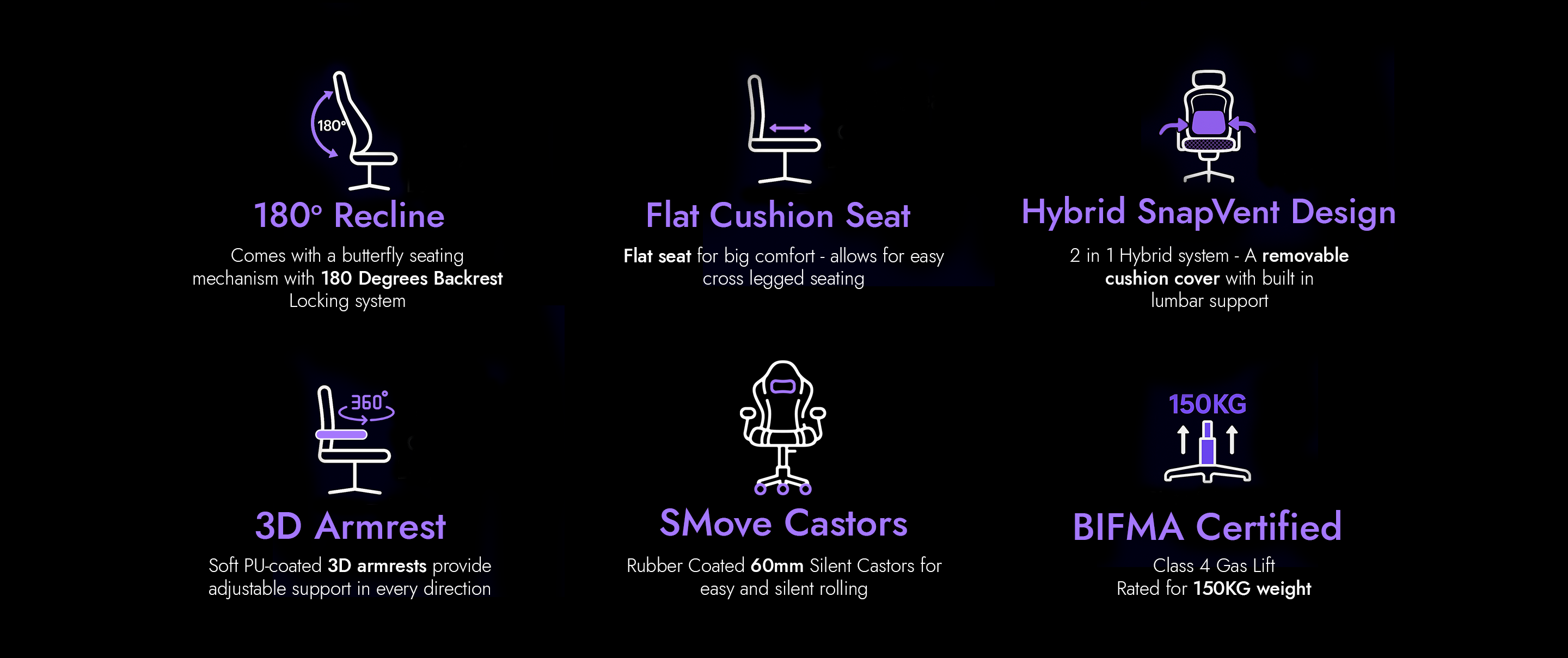 For the love of comfort and memes, the Noctus comes with a butterfly seating mechanism with 180 Degrees Backrest Locking system