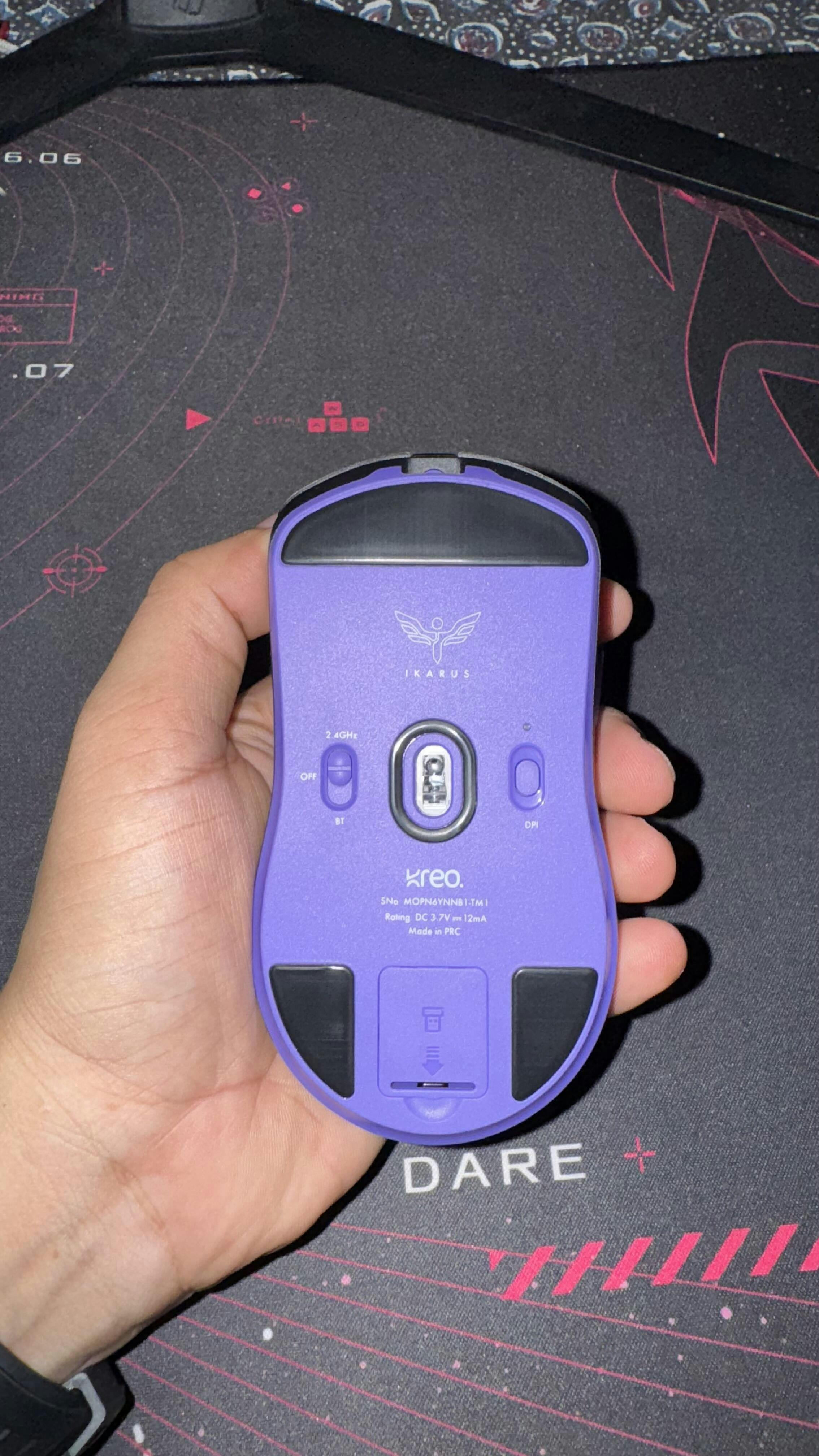 The Ikarus is equipped with a high-performance Pixart 3395 sensor providing up to 26,000 DPI for precise tracking, 650 IPS, and 50g acceleration, ensuring zero smoothing, filtering, or acceleration for competitive gaming.