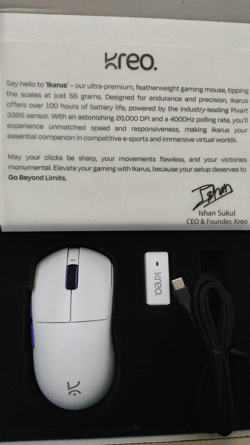 The Ikarus weighs only 55g, making it one of the lightest wireless gaming mice available. This ultra-light design reduces hand fatigue during extended gaming sessions while maintaining precise control.