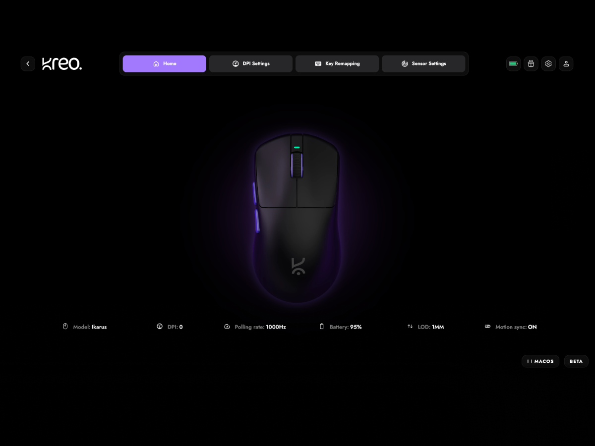 All-in-one online software that lets you configure almost every aspect of your Kreo Gear — key bindings, sensor settings, and DPI settings—with seamless cross-platform support for Windows, macOS, and Linux.